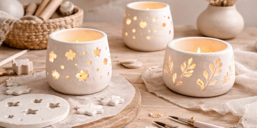Avant que l’argile ne sèche, découpez de petits motifs ajourés. Des étoiles, des feuilles ou des formes géométriques laisseront passer la lumière. Une fois la bougie allumée, les ombres projetées seront magnifiques. Cela transforme instantanément l’atmosphère d’une pièce.