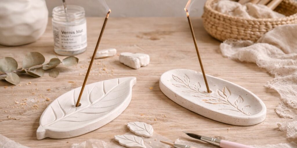 Les porte-encens en argile autodurcissante sont à la fois pratiques et décoratifs. Ils permettent de brûler un bâton d’encens en toute sécurité. Il suffit de modeler une petite base plate et d’y percer un trou adapté. Ce projet est rapide et demande peu de matière.
