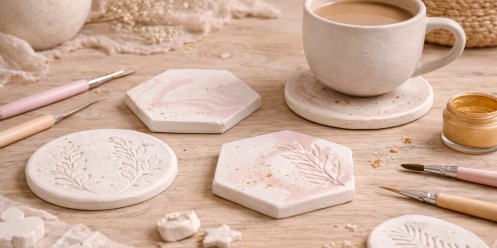 Les dessous de verre en argile autodurcissante sont simples à fabriquer et très utiles au quotidien. Il suffit d’étaler l’argile et de découper des formes rondes, carrées ou hexagonales. Pensez à garder une épaisseur régulière pour assurer la solidité. Après séchage, ils deviennent résistants.