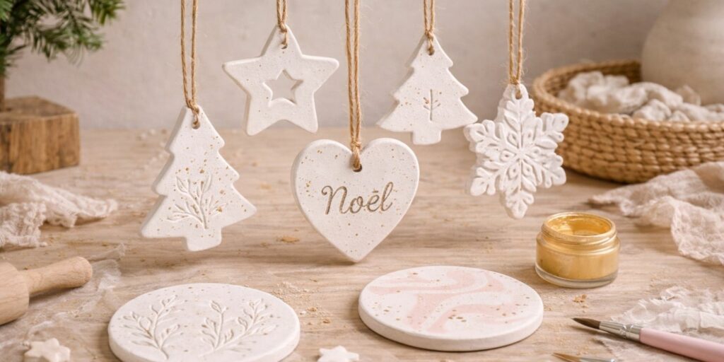 L’argile autodurcissante est parfaite pour créer des décorations de Noël faites main. Étoiles, sapins ou cœurs peuvent être découpés facilement à l’aide d’emporte-pièces. Il suffit ensuite de percer un petit trou pour passer un ruban. Ces ornements sont légers et faciles à suspendre.