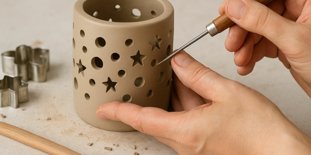 Pour cela, utilisez des emporte-pièces, un petit couteau ou une aiguille à modeler. Travaillez lorsque l’argile est encore fraîche mais pas trop molle, afin que les bords des découpes restent nets. Variez la taille et l’espacement des ouvertures pour un effet plus organique.