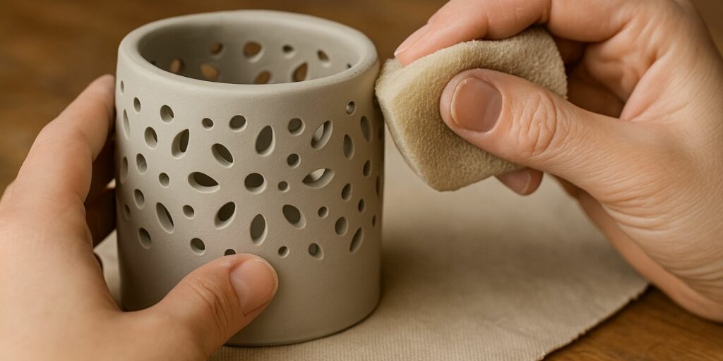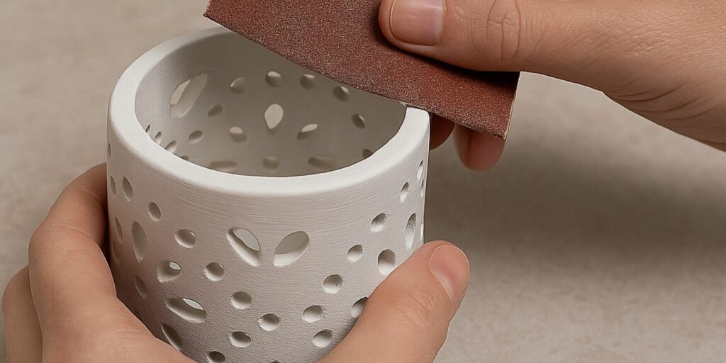 Une fois l’argile complètement sèche, le ponçage permet de parfaire les finitions. Utilisez un papier abrasif à grain fin pour lisser les bords, les arêtes et les zones rugueuses. Cela améliore à la fois l’esthétique et le confort d’utilisation du photophore.