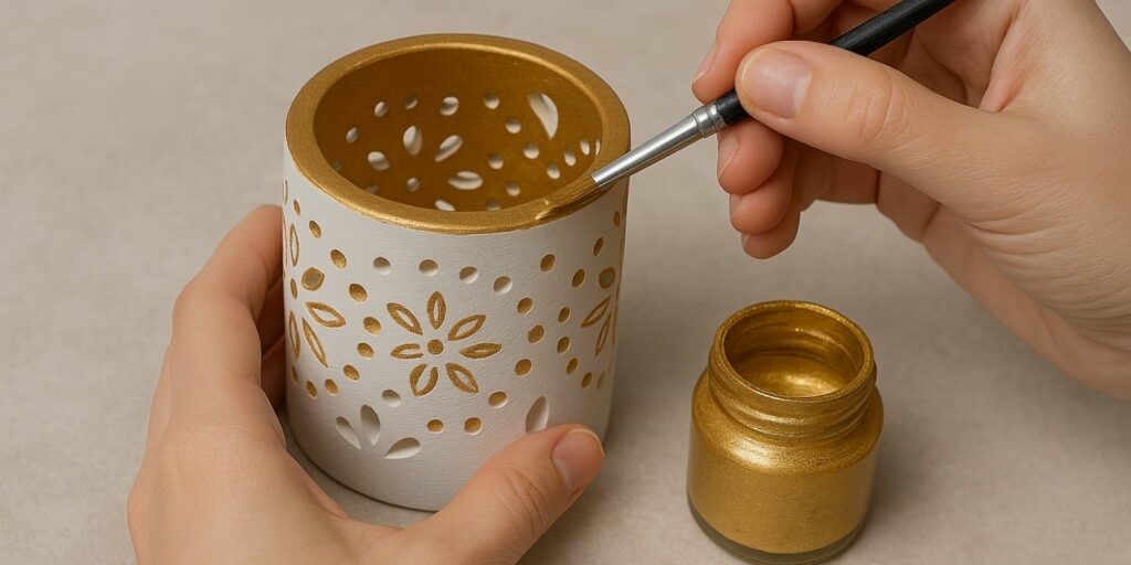 Vous pouvez peindre l’intérieur en doré pour accentuer la réflexion de la lumière, et l’extérieur dans des tons plus sobres ou naturels. Cela crée un joli contraste une fois la bougie allumée. Pensez aussi aux motifs : lignes fines, points, feuilles stylisées ou arabesques.