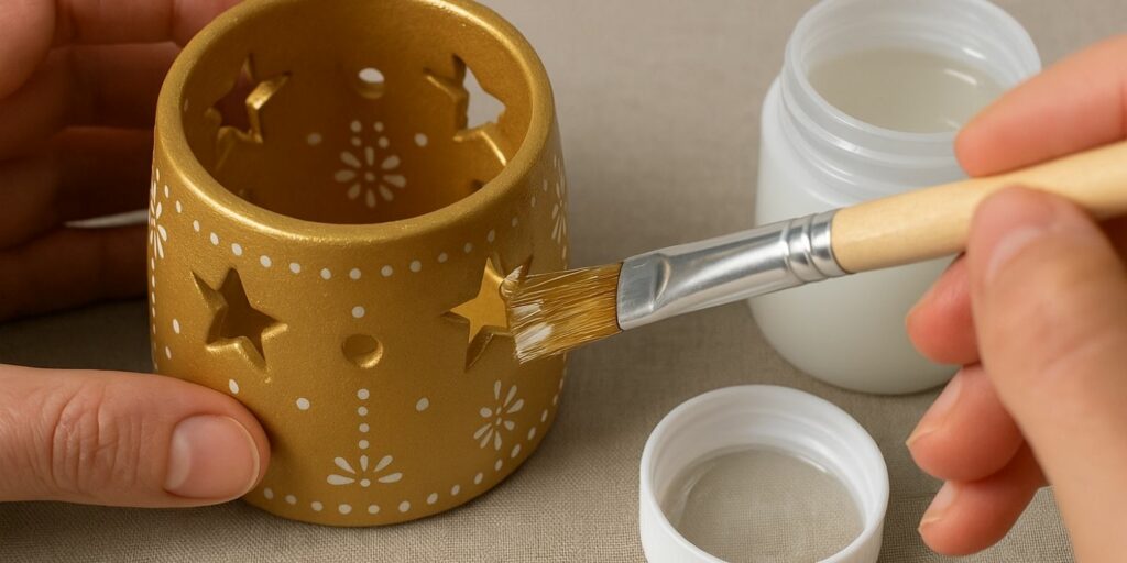 Le vernis est indispensable pour protéger votre photophore de la poussière, de l’humidité et des éventuelles traces de doigts. Choisissez un vernis acrylique transparent, de préférence mat ou satiné pour conserver l’aspect naturel de l’argile, ou brillant si vous souhaitez un effet laqué.