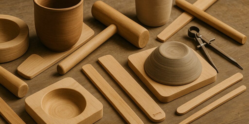 Outils de poterie en bois (rouleaux, baguettes, maillets, compas, kits)