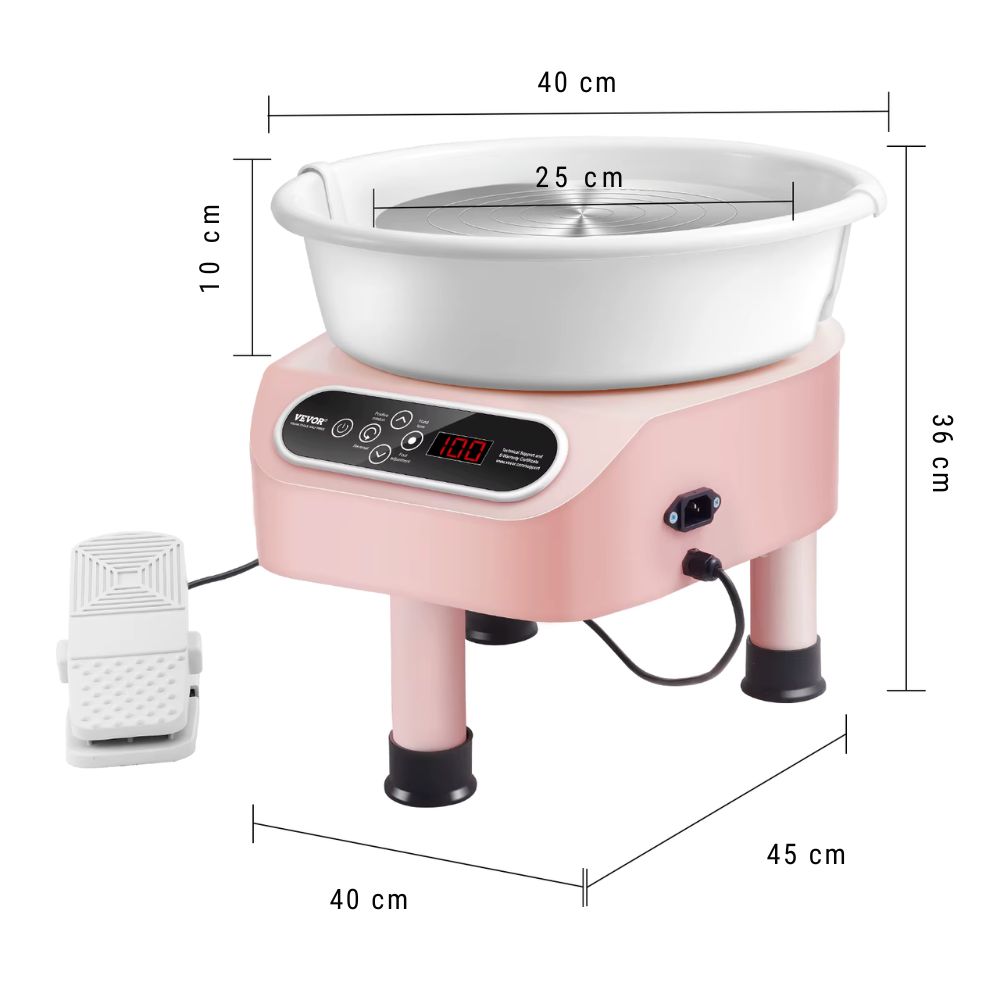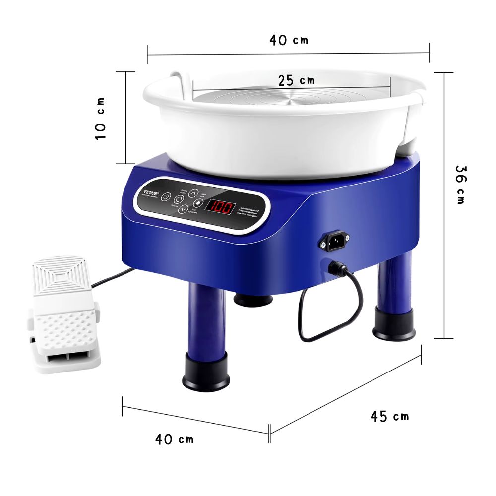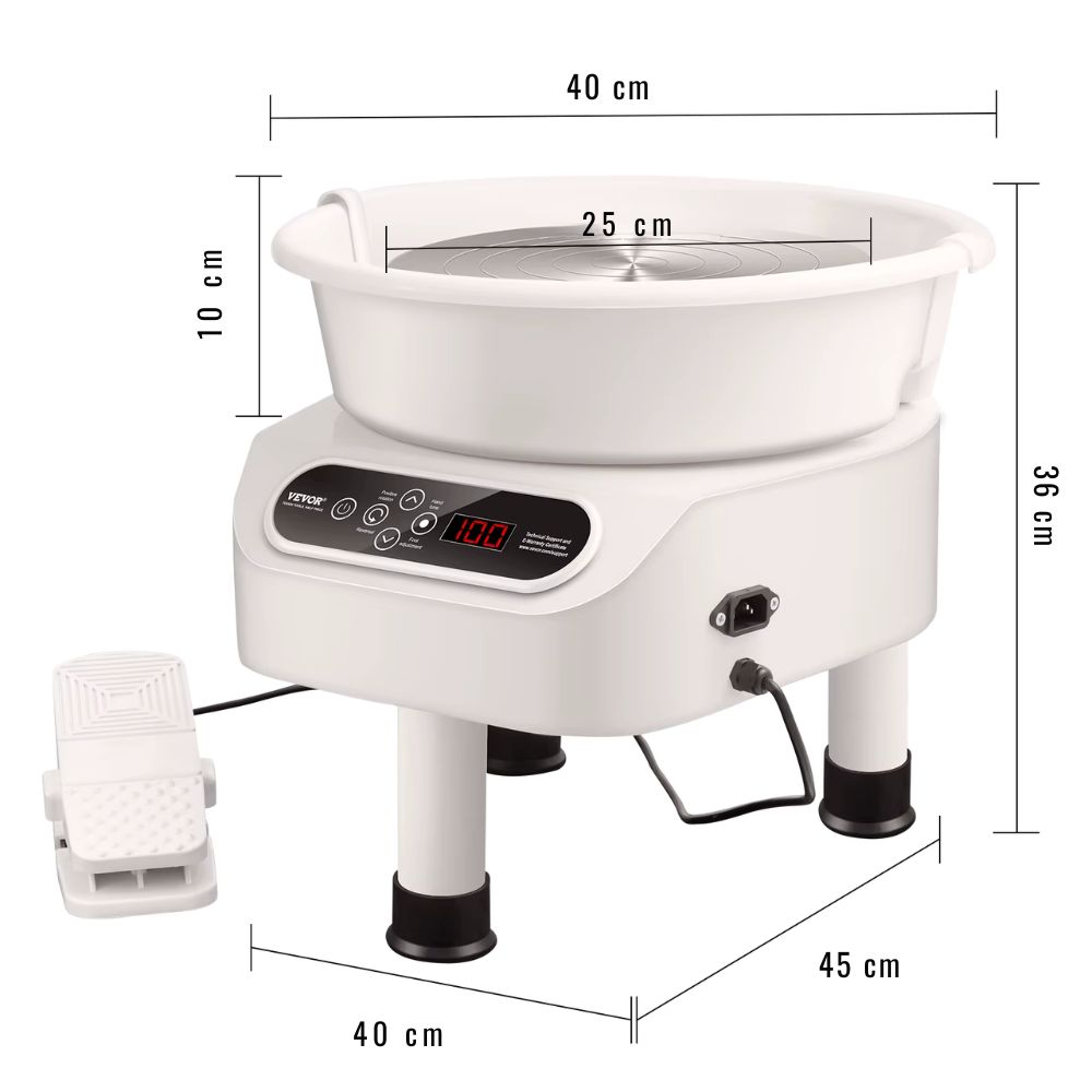 Ce tour de potier mesure 45 x 40 x 36 cm, ce qui en fait un outil peu encombrant mais suffisamment robuste pour vos premières pièces. Son plateau en aluminium de 25 cm de diamètre offre une surface idéale pour modeler bols, tasses ou petits vases. Le moteur silencieux à vitesse réglable (contrôle digital) vous permet d’ajuster la rotation selon votre confort et votre niveau. La pédale de commande assure une expérience fluide et intuitive.
