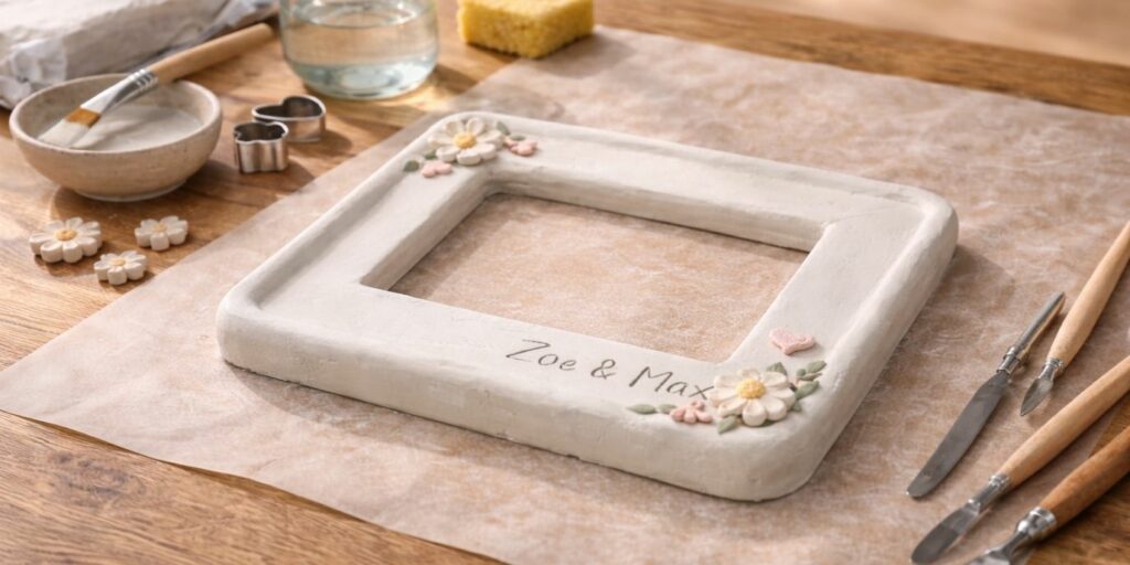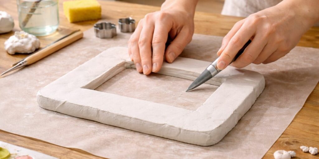 Selon l’épaisseur, l’argile peut mettre 24 à 48 heures à sécher. Ne manipulez pas le cadre tant qu’il n’est pas totalement dur. La patience garantit un résultat solide et durable. C’est une étape qui demande du temps.