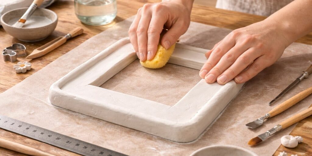 Si des fissures apparaissent, comblez-les avec un peu d’argile humide. Lissez ensuite pour uniformiser la surface. Cette correction préventive évite les défauts après séchage. Le cadre gagne en esthétique et en solidité.