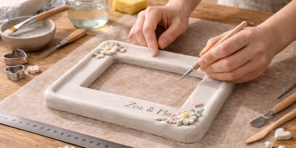 C’est le moment de laisser parler votre créativité. Vous pouvez graver un prénom, une date ou un petit message. Utilisez un outil fin pour inscrire les lettres avec précision. Ces détails rendent votre cadre unique.