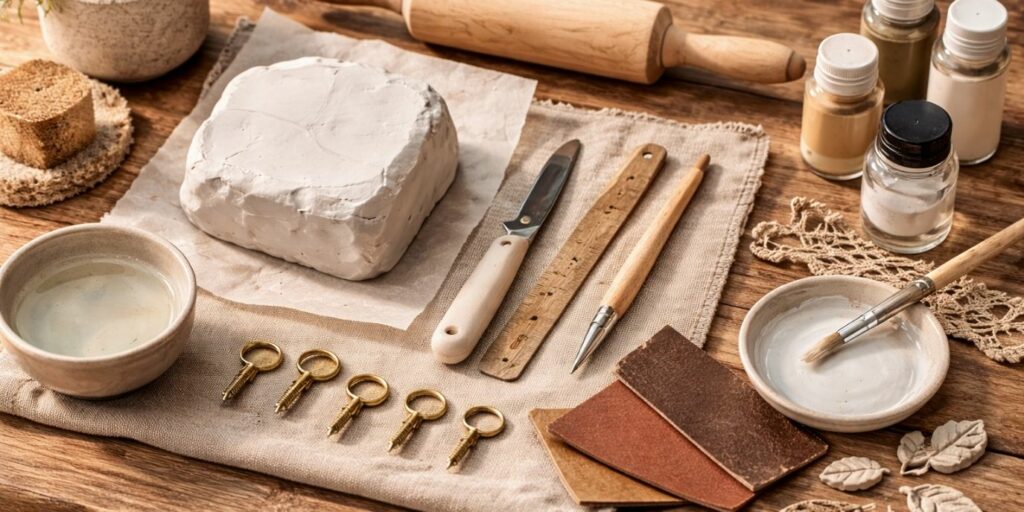 Les crochets ou petits supports à clés sont essentiels pour rendre votre création fonctionnelle. Vous pouvez opter pour des crochets métalliques à visser ou des petits supports à insérer directement dans l’argile avant séchage. Pensez aussi aux vis et chevilles adaptées à votre mur. Le choix des fixations dépendra du poids que devra supporter votre porte-clé mural. Mieux vaut prévoir solide dès le départ.