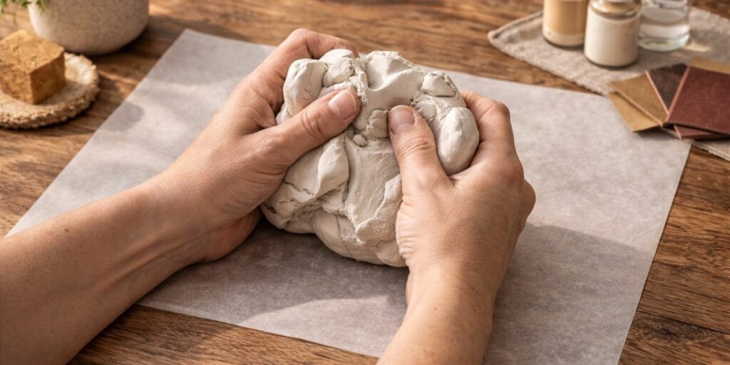 Si l’argile semble trop sèche, ajoutez une très petite quantité d’eau sur vos doigts. Malaxez à nouveau pour bien répartir l’humidité. Attention à ne pas trop mouiller la matière, cela la rendrait collante. L’équilibre est important pour conserver une bonne tenue. Une texture homogène facilite toutes les étapes suivantes.