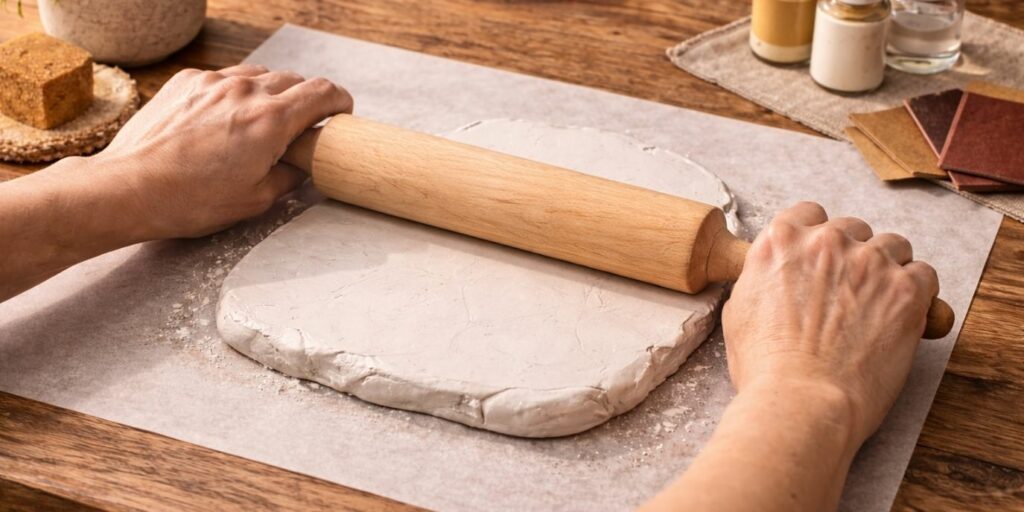 Le pétrissage permet également d’éliminer les bulles d’air. Ces bulles pourraient fragiliser votre porte-clé mural après séchage. Appuyez fermement avec la paume de la main pour chasser l’air. Pliez et repliez l’argile plusieurs fois. Cette technique simple améliore la solidité de votre création.
