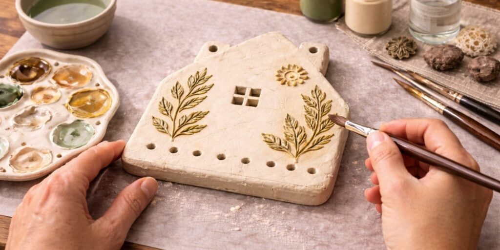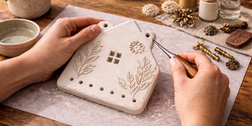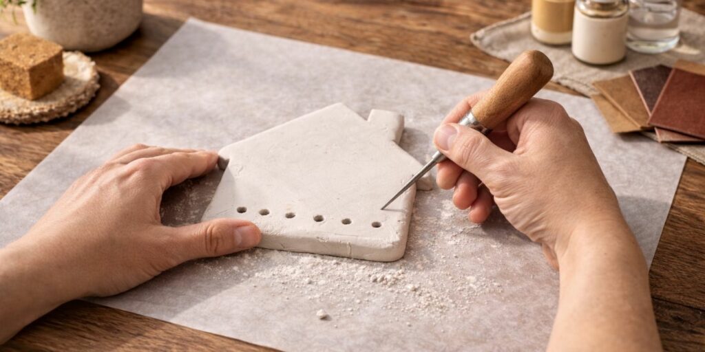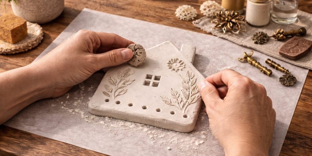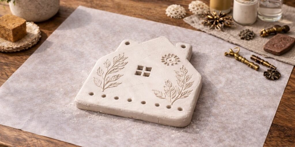 C’est le moment idéal pour personnaliser votre porte-clé mural. Vous pouvez ajouter des motifs en relief directement sur l’argile encore souple. Utilisez des tampons, des feuilles ou des objets texturés. Appuyez doucement pour imprimer les formes. Chaque détail apportera du caractère à votre création.