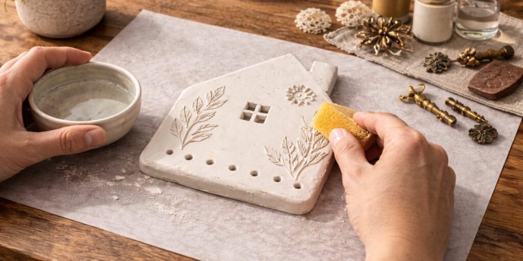 Une fois la forme et les décorations terminées, il est temps de lisser la surface. Trempez légèrement vos doigts dans de l’eau. Passez-les délicatement sur l’argile pour adoucir les imperfections. L’eau aide à fondre les petites fissures. Travaillez avec douceur pour ne pas déformer la plaque.