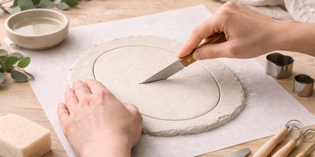 Choisissez la forme que vous souhaitez donner à votre vide-poche. Ronde, ovale, carrée ou plus originale, tout est possible. Placez un gabarit sur l’argile si vous voulez un contour précis. Cela vous aidera à découper proprement.