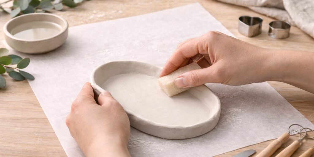 Si l’argile se fissure légèrement, lissez la zone avec un peu d’eau. Humidifiez vos doigts et passez-les délicatement sur la surface. Cela permettra de corriger les petites imperfections. N’ajoutez jamais trop d’eau pour ne pas fragiliser l’ensemble.
