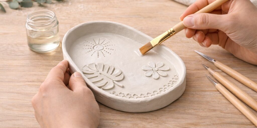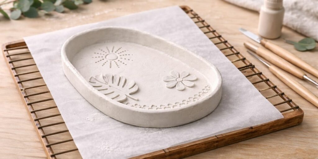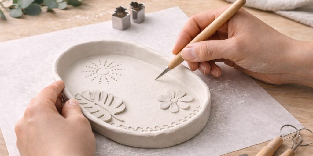 Les empreintes sont également très décoratives. Appuyez une feuille, un tissu texturé ou un tampon sur l’argile encore souple. Retirez délicatement pour révéler le motif. Ce détail apportera du relief à votre vide-poche.
