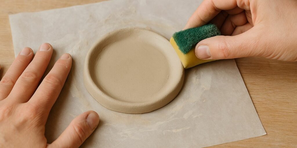 Une fois la forme de la base définie, lissez les bords avec une éponge humide afin d’éviter les irrégularités qui pourraient compliquer l’assemblage des parois. L’objectif est d’obtenir une fondation propre et nette, prête à recevoir les prochaines couches d’argile. Un bon départ facilite le travail de montage et assure une belle tenue finale.