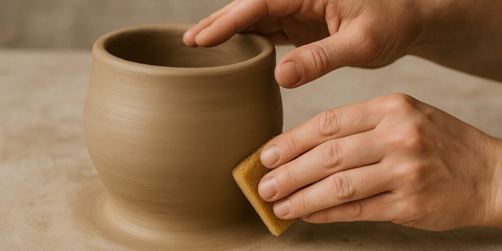Une fois les parois montées, il est temps de lisser l’extérieur du pot pour lui donner un aspect propre et harmonieux. Utilisez une éponge légèrement humide pour effacer les marques de doigts, les irrégularités et les petites fissures. Cette étape demande de la patience, mais elle est essentielle pour obtenir un résultat esthétique. Travaillez par petites zones et repassez plusieurs fois si nécessaire.