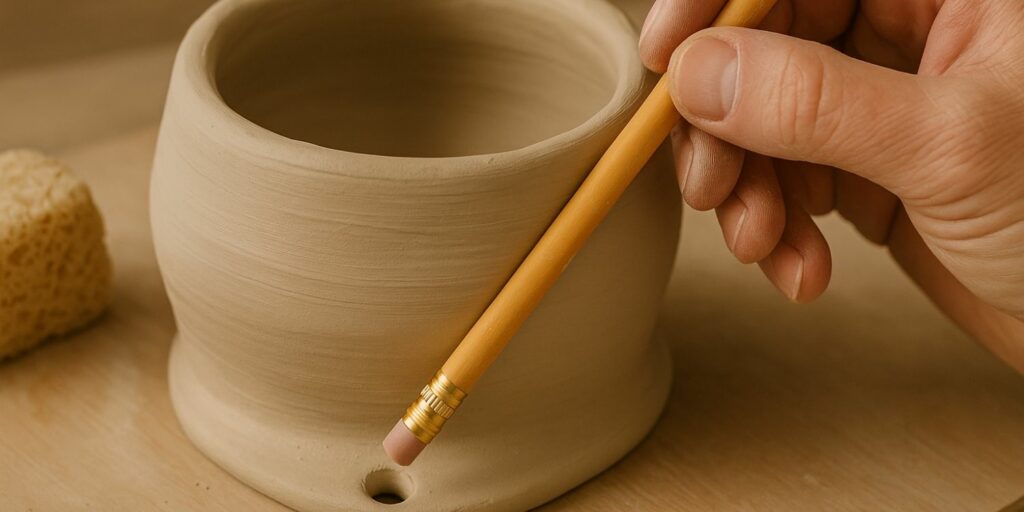 Faites ce trou avant que l’argile ne commence à sécher afin d’éviter les fissures. Veillez à ce qu’il soit centré et de taille suffisante pour permettre un bon drainage sans fragiliser la base. Une fois le trou formé, vous pouvez lisser les bords avec un peu d’eau pour éviter les aspérités qui pourraient abîmer une surface où le pot serait posé.
