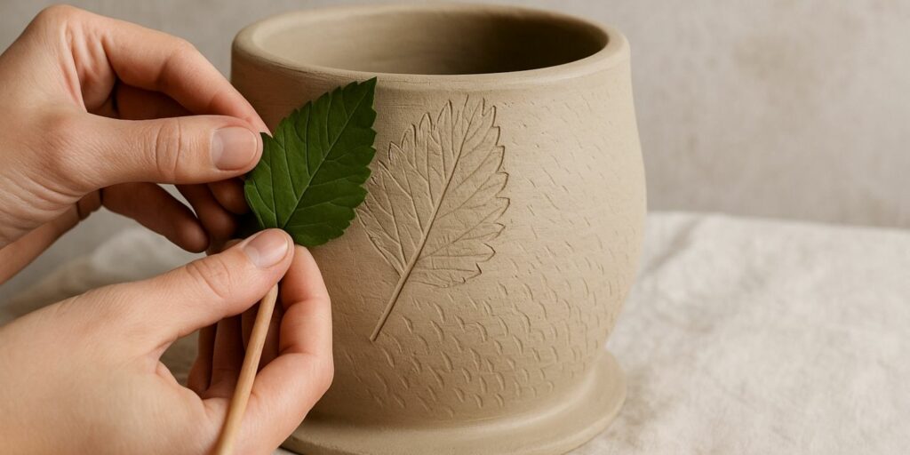 Les textures ajoutent non seulement de l’esthétique, mais elles donnent aussi du relief à votre pot. Cela peut renforcer son aspect artisanal et le rendre encore plus décoratif. Pour un rendu naturel, vous pouvez presser légèrement une feuille contre l’argile pour en imprimer les nervures. Cette technique simple donne un effet élégant et organique.