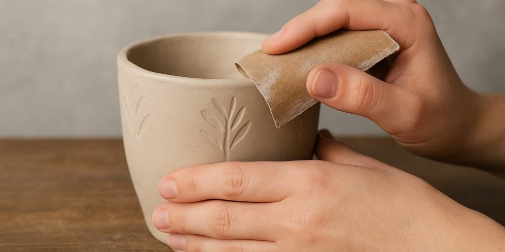 Une fois le pot bien sec et sans fissures, passez à l’étape du ponçage pour parfaire la finition. Utilisez un papier abrasif à grain fin pour lisser les aspérités et uniformiser la surface. Travaillez avec douceur pour ne pas rayer ou abîmer l’argile. Cette étape est essentielle si vous souhaitez un rendu élégant, surtout si vous comptez peindre ensuite.