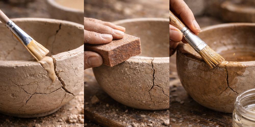 Avant l’application, il est recommandé d’humidifier légèrement la fissure. Cela favorise l’adhérence et permet une meilleure fusion entre la pièce et la barbotine. Une fois appliquée, il faut laisser sécher lentement pour éviter une nouvelle fissuration.